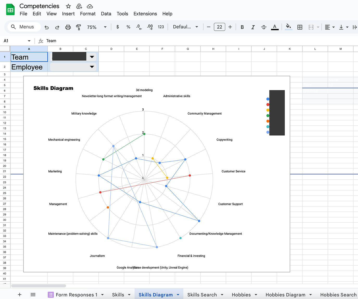 The first solution was a spreadsheet, but hard to update because only a few had access and the employees had to fill a form instead of including their skills directly in the sheet.